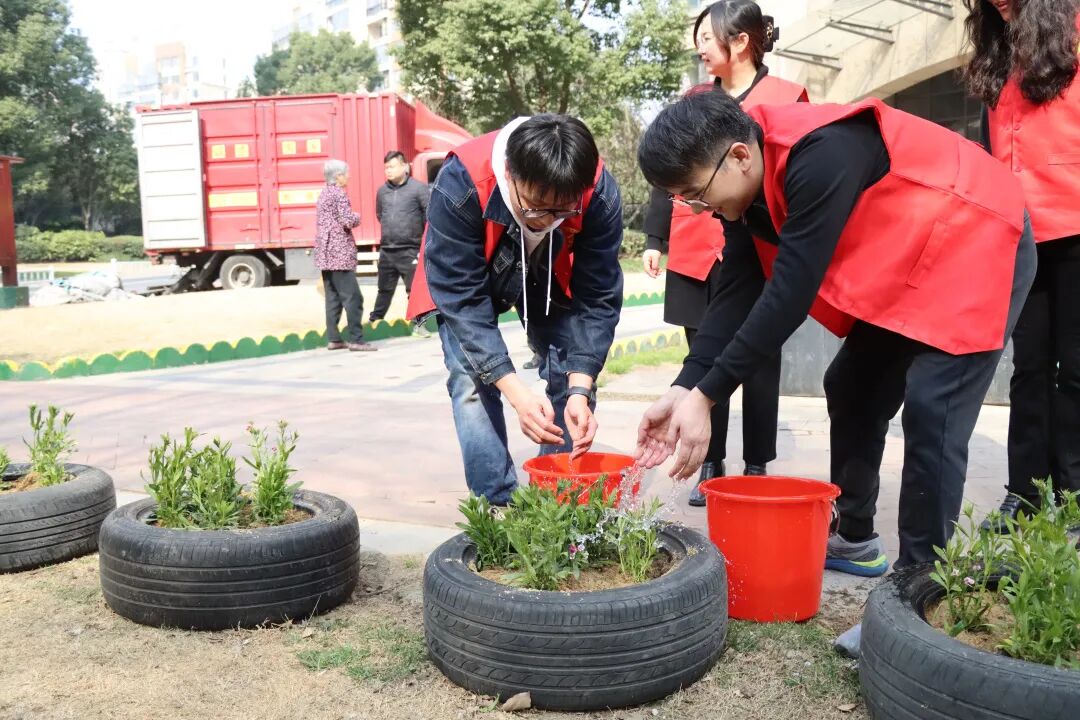 博爱星律师事务所党支部作为世茂社区的党建结对单位,积极参与世茂香槟湖党总支组织的“学雷锋月”志愿服务活动,助力世茂小区“一带一景”景观提升项目的开展,博爱星辰公益法律服务团成员奚志锋律师、杨婷律师、张茹佳律师、李正实习律师现场搬运轮胎、种植绿植,姚龙实习律师现场摄影摄像,看着自己亲手装饰的废旧轮胎变废为宝,大家充满成就感和自豪感;再亲手移植花草,种上各种各样的花卉,一个个轮胎花圃沿路铺展,形成了一道亮丽的风景线。博爱星志愿者们通过活动中的互动促进了交流,将环保理念相互传播和影响,同时增强了投入社区公共环境建设的积极性,使得律师公益服务更加多途径多样性。