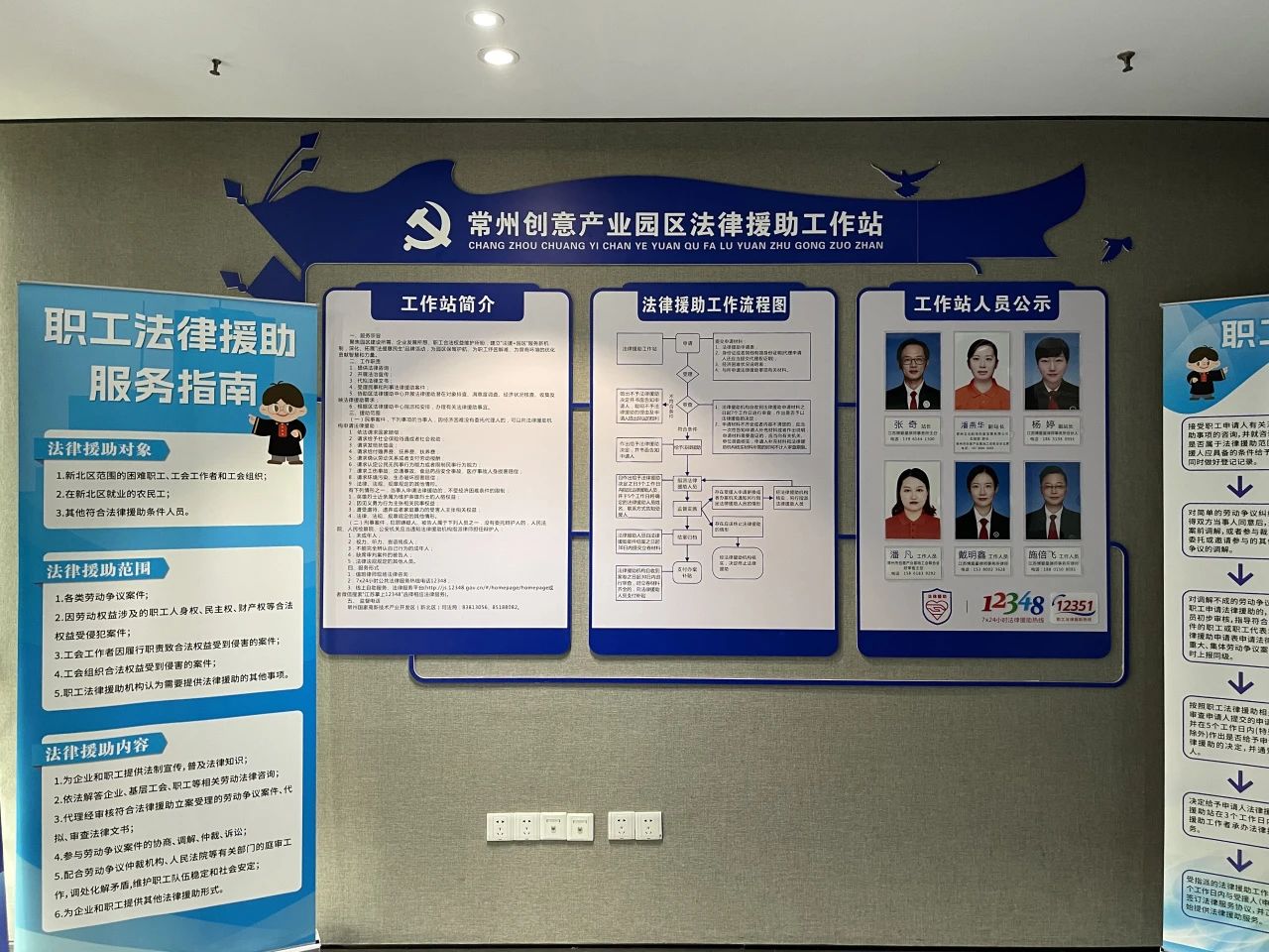 常州创意产业园区法律援助工作站位于我所10楼办公区,是新北区司法局、新北区总工会、常州创意产业园区和江苏博爱星律师事务所共同运行的主要面向周边职工、居民的一站式法律援助工作站,能够为来访职工、群众及企业提供包括法律咨询、法治宣传、法律援助等在内的全方位公益法律服务。本站自2022年9月设立以来,已经先后接待各类法律咨询一百三十余人次,开展公益宣传讲座活动十数场,并办理了多件法律援助案件,为稳固常州市公益法律援助阵地做出了一定贡献。